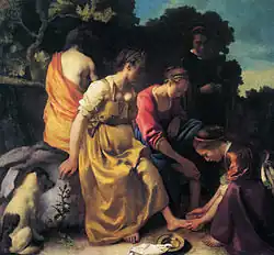 Ovid's Metamorphoses[13] mentions that just before discovering Callisto's pregnancy, Diana washed her feet and then she and her attendants disrobed.[4] Walter Liedtke points out that the nymph standing somewhat apart from the group, with her hands clenched in front of her abdomen, perhaps in contrast with the nymph showing devotion and fidelity by washing feet, may be Callisto. This scene would then illustrate part of that myth narrative, Liedtke asserts,[14] although Wheelock states that the episode seems unrelated to the mood of the painting.[4]