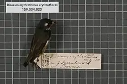 1. ^ BirdLife International (2016). "Dicaeum erythrothorax". IUCN Red List of Threatened Species. 2016: e.T103776345A94538261. doi:10.2305/IUCN.UK.2016-3.RLTS.T103776345A94538261.en. Retrieved 13 November 2021.