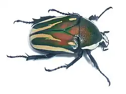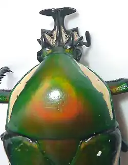 In Dicronorhina derbyana layardi the basic body colour is usually metallic green with an ochre sheen and white stripes on the pronotum and elytra. In D. d. conradsi the body is maroon with a blue sheen and tan stripes. It is completely metallic ginger to emerald green in Dicronorhina derbyana oberthueri.[1] The males have a T-shaped, flat horn in the forehead. The larvae live in the soil on decaying vegetable material, while the adults feed primarily on tree sap and fruits. A female lays up to 200 eggs. The full life cycle will take 8–9 months, and the adult beetles can live 3–4 months.
