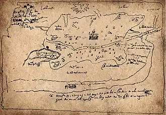 In Spain, De Torres y Moyachoque befriended Juan Bautista de Monzón and both traveled back to South America, De Monzón being the new visitador of the colony.[5] Here, the Spanish colonisers immediately accused both men to work against the Spanish Crown and convicted De Torres y Moyachoque to death. He promptly fled into the mountains of the Altiplano Cundiboyacense, but later returned to Turmequé. In 1578, he made the first map of the Bogotá savanna, including Santa Fe de Bogotá and surrounding settlements, the Bogotá River and Sué rising over the Llanos Orientales.[10]
