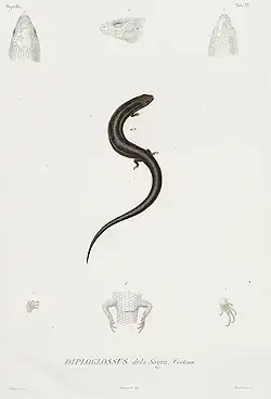 • Cocteau [J-T], Bibron [G] (1838). "Reptiles " pp. 1–143. In: de la Sagra R (1838). Historia Fisica, Politica y Natural de la Isla de Cuba. Segunda Parte. Historia Natural. Tomo IV. Reptiles y Peces. Paris: Arthus Bertrand. 255 pp. ("SEINCUS [sic] (DIPLOGLOSSUS) DE LA SAGRA", new species, pp. 110–114 + Plate XX). (in Latin and Spanish).