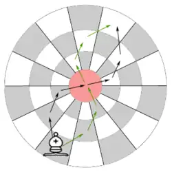 The rook, bishop, horse (knight) and king move as in orthodox chess. The movement through the center is illustrated by the figure. From the center, a rook and a bishop can reach any square on the board. A horse in the center can reach any square in the two inner rows (2 and 3). The rook is not allowed to do a "null move", i.e. to move 360° around the board back to the same square in one move.