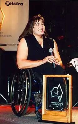 In 1993, Sauvage was awarded the Medal of the Order of Australia for her contribution to sport. Sauvage was named the Australian Paralympian of the Year in 1994, 1996, 1997 and 1998.[20] In 2000, Sauvage won the "Female Athlete of the Year" award in the Sport Australia Awards and the World Sportsperson of the Year with a Disability at the Laureus Sports Awards.[21] In 2007, she was inducted into the Sport Australia Hall of Fame, and in 2019 was made a Legend in the Sport Australia Hall of Fame, becoming the first Paralympic athlete to be awarded Legend status.[22]