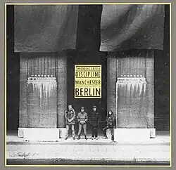 The "Discipline" single features two versions of the title track, recorded in Berlin and Manchester.[1] The center labels are cream with black printing, and a glossy picture sleeve depicts the band standing outside the ex-Nazi Ministry of Propaganda in Berlin, and the other side shows Val Denham holding a Hitler Youth dagger centre back.[2] The words "Techno Primitive" were scratched on side A and "Psykick Youth Squad" on side B. Both tracks were later released on the CD version of 20 Jazz Funk Greats.