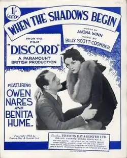Discord is a 1933 British drama film directed by Henry Edwards and starring Owen Nares, Benita Hume and Harold Huth.[1] Its plot involves a struggling composer who has to be supported financially by his wealthier wife. It was based on the play A Roof and Four Walls by E. Temple Thurston. It was made at British and Dominion Elstree Studios for release by Paramount Pictures.[2]