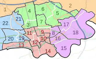 The City of Preston is divided into 22 wards, which are used in the creation of "Area Forums", local consultative bodies organised by city council; and also the composition of parliamentary constituencies.