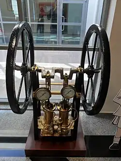 Rotary pumps are driven by a crankshaft that is rotated by handles on two flywheels attached to the ends of the shaft on each side of the pump. Rotary pumps were built with one, two or three cylinders,[3] and are operated by a team of two men. Pistons attached to the crankshaft draw in air through the inlet valves and then pump it through the outlet valves to an air hose which delivers the air to the helmet of the diver. Cylinders, valves and outlet fittings for air are generally made from brass for corrosion resistance in the marine environment. Rotary operated pumps were manufactured with single or double action.[4][3]