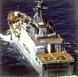 A dock landing ship (also called landing ship, dock or LSD) is an amphibious warfare ship with a well dock to transport and launch landing craft and amphibious vehicles.[1] Some ships with well decks, such as the Soviet Ivan Rogov class, also have bow doors to enable them to deliver vehicles directly onto a beach (like a tank landing ship). Modern dock landing ships also operate helicopters.