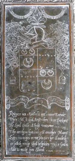 The slab was originally placed in the churchyard outside the chancel door, but in 1848 was brought inside and set into the floor of the chancel.[16] However, it "disproves the assertion of poverty" as it is a costly item comprising a brass plate beautifully engraved with the arms of Docton quartering Chantrell. Below are two texts from the Bible. The ledger stone of his wife Alice Atkin in similar form survives. As he left no surviving issue he "left his inheritance to one of his name",[17] namely his first cousin Thomas II Docton (d.1638),[18] the eldest son of Richard Docton (d.1570/1) of Welsford.