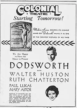18. ^ "Mr. and Mrs. Walter Huston Star Tonight in "Dodsworth"". Youngstown Vindicator (Ohio). 1937-10-04. p. 10. Retrieved 2021-06-30.