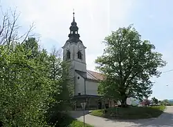The local parish church, built on a slight elevation in the western part of the settlement, is dedicated to Saint Roch (Slovene: sveti Rok) and belongs to the Roman Catholic Archdiocese of Ljubljana. It was built in 1818.[4] A chapel dedicated to Saint Margaret, outside the settlement to the east, is the converted surviving sanctuary of a larger 16th-century church, belonging to the same parish.[5]