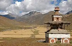 Chorten with barley fields; Tarap Valley in the southern part of Dolpa.