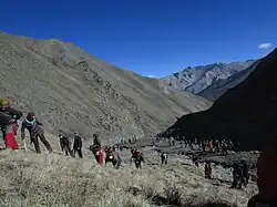 Agriculture is possible at heights of 3,800 to 4,180 metres (12,470 to 13,710 ft) (villages of Shimen Bentsang Valley and Chharka, respectively) but often requires irrigation.[1]: 22  Apart from barley, crops include buckwheat, millet, mustard, wheat, potatoes, radishes,[1]: 22  and spinach. Similar to transhumance in the Alps, the population migrates between villages and high-lying (4,000 to 5,000 metres or 13,000 to 16,000 feet) summer pastures, in a lifestyle referred to as samadrok (roughly "farming nomads").[1]: 44, 50
