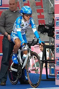 Later that year, he sailed to victory in stage 8 of the Giro d'Italia, attacking on the slopes of the Colle Molella, 7 kilometres (4.3 mi) away from the finish. His nearest pursuant, Spaniard Beñat Intxausti of Movistar Team, completed the stage with a 23 seconds deficit on Pozzovivo.[29] He finished the Giro eighth overall, being always very competitive in the mountain stages. In June, Pozzovivo prevailed in the queen stage of the 2.1 rated Tour of Slovenia, a 219 kilometres (136 mi) course peppered with climbs. Pozzovivo broke away with Janez Brajkovič of Astana and somewhat surprisingly, beat Brajkovič in the sprint.[30] With that operation, he took the overall classification leader's jersey thanks to a six-second lead over Brajkovič, but lost it the next day in the individual time trial, where Brajkovič bested him by ten seconds. Pozzovivo had to settle for the second place of the Tour.[31]