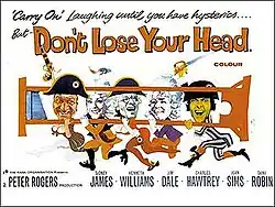 Don't Lose Your Head is a 1967 British swashbuckling comedy film, the 13th in the series of 31 Carry On films (1958–1992). It features regular team members Sid James, Kenneth Williams, Jim Dale, Charles Hawtrey, and Joan Sims. Set in France and England in 1789 during the French Revolution, it is a parody of Baroness Orczy's The Scarlet Pimpernel.