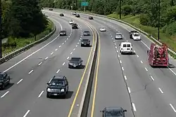 The section immediately south of Highway 401 is often congested at all hours. Traffic studies have attributed congestion in the southbound lanes to the number of lanes merging from Highways 401 and 404 into the parkway and the lane changing that results from merging traffic from Highway 401 clashing with exiting traffic to the nearby York Mills exit.[34] Congestion in the northbound lanes is attributed to truck traffic coping with the steep grade of the valley, lane changing, and insufficient advanced signage for Highway 401. Most traffic in this section travels north on Highway 404, but only two of the five lanes lead to it.[35]
