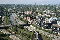 As it crosses Eglinton, the expressway passes a business park to the west and the Concorde Place commercial and condominium development to the east. The expressway begins to descend back into the East Don Valley. It passes beneath Wynford Drive and two railways (the CPR Midtown line and the CNR/Richmond Hill GO line) before reaching Lawrence Avenue East, one of the few remaining cloverleaf interchanges in Ontario.[22] This area, known as Milne Hollow, is partially forested, some of the land being conservation reserve.[23][24]