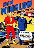 Fawcett Comics released the Don Winslow of the Navy comic book with original stories beginning in 1943.[12] The cover of the first issue shows Captain Marvel introducing the character to the readers. This series lasted until 1948, then was revived in 1951, for a total to 69 issues.[13] Winslow was revived again for a final brief time starting in 1955 in reprints published by Charlton Comics.[14]