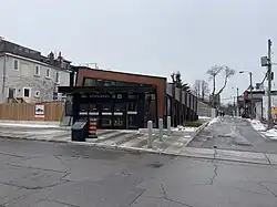In early 2021, construction work on the second exit, access tunnels and elevators at Donlands station had begun. The second exit is located at 17/19 Dewhurst Boulevard;[7] a residential building was demolished in late 2020 to make way for the second exit. Tunnels from the second exit building extended under Dewhurst and Strathmore Boulevards, connecting to the western end of the existing platforms.[7] The surface–concourse–eastbound platform elevator is located within the existing station property on the southwest corner of Donlands Avenue and Strathmore Boulevard, while the concourse–westbound platform elevator is located underneath the playground of a daycare centre on the northwest corner of the same intersection.[7] The project was completed in August 2024.[8]