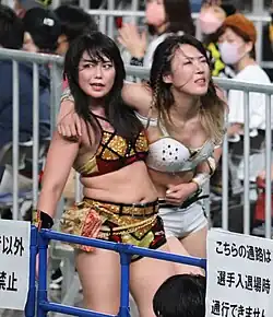 In January and February 2023, Giulia, Sakurai and Thekla competed in the Triangle Derby I under the team name Baribari Bombers.[40] In January and March, Sakurai teamed up with Chanyota to compete in the tournament to determine the inaugural New Blood Tag Team Champions. They lost to Karma and Starlight Kid in the semi-finals.[41][42] At Supreme Fight 2023 on February 4, MaiHime unsuccessfully challenged 7Upp (Nanae Takahashi and Yuu) for the Goddesses of Stardom Championship, and Giulia successfully defended the World of Stardom Championship against Suzu Suzuki.[43] On April 23, at All Star Grand Queendom, Himeka wrestled one of her last matches in Stardom upon retirement against long time tag team partner Maika, which the latter won.[44] At Flashing Champions 2023 on May 27, the Baribari Bombers won the Artist of Stardom Championship by defeating REStart. Also at Flashing Champions, Maika teamed up with Mei Seira and Suzu Suzuki to defeat Neo Stardom Army (Nanae Takahashi and Yuna Mizumori) and Hanako.[45] Following this, Seira and Suzuki would continue to frequently team up with various members of Donna Del Mondo in tag team matches, especially Maika. On July 30, Maika teamed up with Mei Seira and Megan Bayne to defeat God's Eye (Saki Kashima and Syuri) and Hanako,[46] after which Bayne would continue to frequently team up with members of Donna Del Mondo. At Nagoya Golden Fight on October 9, Maika, Megan Bayne and Suzu Suzuki teamed up to challenge the Baribari Bombers for the Artist of Stardom Championship.[47] During the match, there were several instances of miscommunication between Maika and Suzuki, which led to the Baribari Bombers winning.[47] In an after-match promo, Maika blamed Suzuki for the loss and promised to defeat Suzuki, which effectively meant the end of Suzuki and her tag team partner, Mei Seira, teaming with Donna Del Mondo.[47]