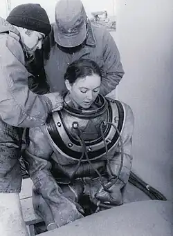 At the age of 21, she applied to the Navy 2nd Class Diving School and was accepted two days before the program started in January 1975.[5] During training, she was required to dive while carrying more than 200 pounds of gear in dark, cold or turbulent water. Despite this, Tobias became the first woman to graduate from the Navy Deep Sea Diving School and went on to work with the Navy search and salvage operations.[6] However, she was still limited opportunities due to her gender. She was unable to join sea duty billets so she accepted a position as an instructor at the Submarine Escape Training Tank at Submarine Naval Base in New London.[3] Tobias also worked within the hyperbaric chamber to treat divers suffering embolisms and civilians suffering from carbon monoxide poisoning and gangrene.[1] Retired Master Diver Steven Lechner believed Tobias was the first woman to teach in the escape tank.[5] Her brother Gary also enlisted in the Army, and she was his instructor at the diving school on base.[3]