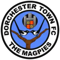 The club's current badge is circular, with the words 'Dorchester Town F.C.' and 'The Magpies' on a white outer rim, in black text. The central area contains two magpies on a brown branch in front of a sky blue background. Above them is a design based upon the town's coat of arms, a purple circle containing a castle, upon which is a shield.