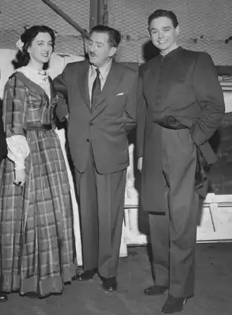 Dorothy Warenskjold with Walt Disney and tenor James Melton on the set of Melton's "Ford Festival" show.