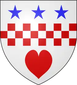 The arms are based on those of the Earl of Douglas, which at the time the Mains branch was established, had three stars, but an uncrowned heart. The addition of a fess chequy represented the Lennox land (inherited through the Galbraiths) that formed the estate. The fess of the Stewart Earls of Lennox arms was a silver and blue check, but the Mains family changed the check colour to red (an old Lennox colour).[17]