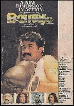 Douthyam (transl. Mission) is a 1989 Indian Malayalam-language action thriller spy film directed by S. Anil Kumar[1] and written by Gayathri Ashokan. The film stars Mohanlal, Suresh Gopi, Parvathy, and Babu Antony. The film attracted media attention for the action subject as the script was done by the poster designer Gayathri Ashokan.