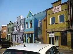 Storefronts on Elliott Street. The street is a major east–west thoroughfare in Downtown Whitehorse.