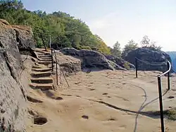 Drábské světničky is a ruin of a 13th-century rock castle in the Czech Republic. It is located about 4 kilometres (2.5 mi) northeast of Mnichovo Hradiště on the ragged edge of a sandstone cliff high above surrounding landscape. The castle covers a group of seven sandstone rocks, connected with wooden bridges. It has been abandoned since the Hussite wars in the 15th century.