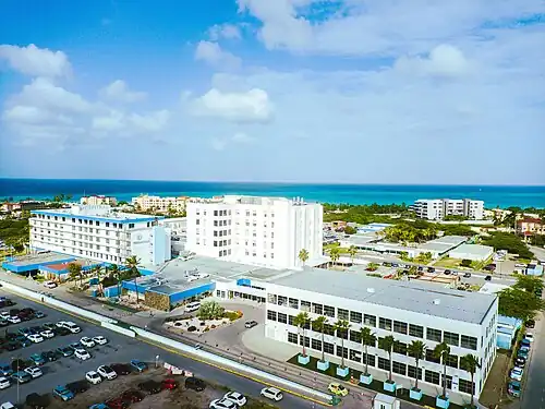 The hospital building is located northwest of the capital city of Oranjestad where the Arend Petroleum Company at Eagle was formerly located. Named after physician Horacio Oduber, the 187-bed hospital was put into use in late 1976. On March 5, 1977, the official opening took place in the presence of Dutch minister De Gaay Fortman.[1] In September 2014, the start of the hospital's expansion and renovation project began, one of the largest construction projects in Aruban history. Including a new bed house, a three times larger emergency room, a new outpatient clinic for specialists and the remodeling of the building. The final phase of this project will resume at the end of the year 2023 after a dispute by parties caused construction to be halted in 2022.