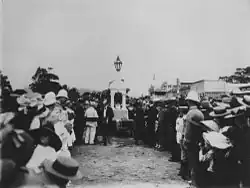 The memorial was still in the Townsville workshops in late May 1903 but was in place at the intersection of Abbott and Spence Streets by 13 June 1903, when it was unveiled by Major-General Sir Herbert Chermside, the Governor of Queensland. By c. 1920, the memorial also carried two street signs. By the late 1920s the single lamp and lamp base at the top of the dome had been replaced with a pair of gas street lamps suspended from a tall metal column. By the late 1940s, the lamps and lamp fitting at the top of the dome had been removed entirely. Photographic evidence suggests that the memorial remained in the centre of the intersection until at least the mid-1960s, but had been removed to nearby Anzac Memorial Park (bounded by Abbott and Spence Streets and the Esplanade), by the mid-1970s. It was relocated within this park following redevelopment of the reserve in the mid-1990s.[1]