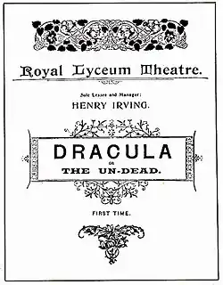 A limited stage adaptation of Stoker's story was performed to a small audience at the Lyceum Theatre in the year of the book's publication, in order to protect Stoker's copyright. The script for this four-hour performance is lost.[3]