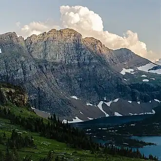 The Dragons Tail is an 8,580-foot (2,620-meter) elevation ridge located in the Lewis Range, of Glacier National Park in the U.S. state of Montana. It is situated on the Continental Divide, on the border shared by Flathead County and Glacier County. Topographic relief is significant as the north aspect rises 2,200 feet (670 meters) above Hidden Lake in one-half mile, and the west aspect rises nearly 4,700 feet (1,400 meters) above Avalanche Lake in two miles. It can be seen from the Hidden Lake overlook along with its nearest higher neighbor, Bearhat Mountain, 1.27 miles (2.04 km) to the northwest.[1]