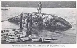 In historical sources, it is not always clear whether a given cetacean washed up alive or dead, but the term "drift whale" focuses on the benefits of its carcass – meat, blubber, fat, and other products – to the people who claimed it.[1] Nowadays, when a dead whale washes up on a beach, often the authorities are required to dispose of it as a potential hazard to human health, so the resource implications go the other way: a drift whale is no longer a benefit to a community, but an expensive disadvantage.[2]