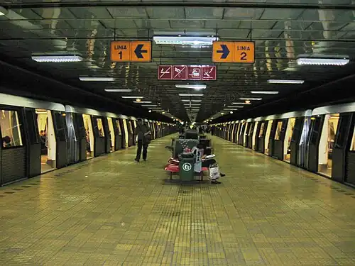 Dristor is a major metro station in Bucharest. It is located on the Bd. Camil Ressu – Șoseaua Mihai Bravu – Calea Dudești junction. The half of the station at the end of metro line 1 is called Dristor 2; the other half is Dristor 1, where trains of metro line M1/M3 pass through. Having two separately named parts of the station in one small space can cause confusion for people because both parts of the station have metro line M1 either passing through, which occurs at Dristor 1, or ending at Dristor 2. Signs guide passenger to either terminals.