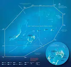 The Dry Tortugas is a small archipelago of coral islands about 70 miles (110 km) west of Key West, Florida. They represent the westernmost extent of the Florida Keys, though several reefs and submarine banks continue westward outside the park, beyond the Tortugas.