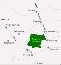 The Dryandra Woodland National Park is a national park in Western Australia within the shires of Cuballing, Williams and Wandering, about 164 kilometres (102 miles) south-east of Perth and 22 kilometres (14 miles) north-west of the town of Narrogin. It is a complex of 17 distinct blocks managed by the Western Australian Department of Biodiversity, Conservation and Attractions and spread over approximately 50 kilometres (31 miles) separated by areas of agricultural land. The area is considered to be one of the state's major conservation areas, and although it is far from pristine due to its history of logging operations, a number of species of threatened fauna are rebuilding populations through the removal of introduced predators such as foxes and feral cats.