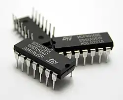 In microelectronics, a dual in-line package (DIP or DIL)[1] is an electronic component package with a rectangular housing and two parallel rows of electrical connecting pins. The package may be through-hole mounted to a printed circuit board (PCB) or inserted in a socket. The dual-inline format was invented by Don Forbes, Rex Rice and Bryant Rogers at Fairchild R&D in 1964,[2] when the restricted number of leads available on circular transistor-style packages became a limitation in the use of integrated circuits.[3] Increasingly complex circuits required more signal and power supply leads (as observed in Rent's rule); eventually microprocessors and similar complex devices required more leads than could be put on a DIP package, leading to development of higher-density chip carriers. Furthermore, square and rectangular packages made it easier to route printed-circuit traces beneath the packages.