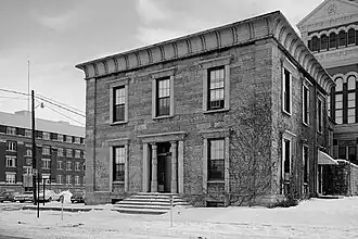 The Dubuque County Jail is a historic building at 36 East 8th Street in Dubuque, Iowa, United States. Completed in 1858, the jail is an example of the uncommon Egyptian Revival style. It is architecturally a highly original work of John F. Rague, who also designed the 1837 Old Capitol of Illinois and the 1840 Territorial Capitol of Iowa.[3] The building was designated a National Historic Landmark for its architecture in 1987. It served as a jail for more than a century, became a museum in 1975, and was converted into county offices in 2016.