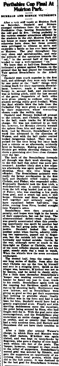 The following season, Dunkeld & Birnam won the Perthshire Cup for the only time, beating Breadalbane 4–2 in the final at Muirton Park (a Breadalbane protest over the eligibility of goalkeeper Watson being dismissed),[9] and the Consolation Cup in 1925–26. The club also reached the first round of the 1928–29 Scottish Cup, albeit thanks to a walkover and a bye. In the third round of the Qualifying Cup, the club lost at Berwick Rangers, a low crowd being blamed on the match being played at harvest time.[10] In the first round of the Cup itself, the club had an easier draw than before, at home to Clackmannan. However, after the game had to be postponed twice because of bad weather, Dunkeld & Birnam scratched, unable to bring the team together a third time.[11]