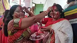 Another notable tradition on Vijaya Dashami is Sindur Khela.[27] Married women smear vermillion on each other's foreheads and apply it to the goddess’s forehead while praying for her blessings. Sindur Khela is a symbol of joy and is one of the most colorful customs of Durga Puja.[28]