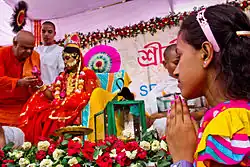 Mahashtami is the most significant day of Durga Puja. On this day, the Mahagauri form of the goddess is worshipped. The day begins with the chanting of Sanskrit hymns, and thousands of devotees offer Anjali to the goddess.[22] The primary ritual of Ashtami is Kumari Puja, where a young girl is worshipped as a living embodiment of Goddess Durga, symbolizing the reverence for feminine power.[23][24] Another vital ritual of Ashtami is the Sandhi Puja, which takes place at the juncture of Ashtami and Navami. This Puja is especially held in memory of the goddess's victory over Mahishasura in her form as Mahishasuramardini. During Sandhi Puja, 108 lamps are lit, and 108 lotus flowers are offered.[25]