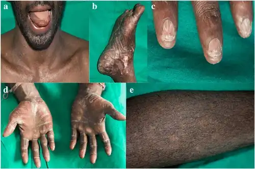 This photo shows the patient with dyskeratosis congenita, who has symptoms of this disease, namely oral leukoplakia, reticular hyperpigmentation of the neck and upper chest and lower limb, hypopigmented patches on the leg, and dysplastic fingernails.