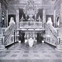 At the time of construction in 1923, the theatre was the costliest theatre ever constructed in Philadelphia.[3] The opulent grand theatre in the Italian renaissance style contained 2768 seats, of which 1164 seats were on the balcony.[9] The stage measured 62 feet by 35 feet.[3] George Matthews Harding painted the extravagant murals and friezes, and marble was imported from Italy.[9]