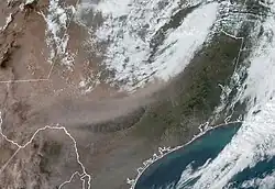 In Southeast Texas, a large dust cloud hit Houston, dropping visibility to as low as 3 mi (4.8 km) in some areas and causing poor air quality.[58]