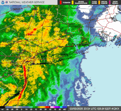 In Pennsylvania, pea-sized hail was recorded as the storm complex moved over the Northeast late on March 5.[63] New York City experienced heavy rainfall that inundated underground subway stations. In addition, a wind advisory was issued early on March 6 from the National Weather Service, with gusts reaching 45 to 50 mph (72.4 to 80.4 kmh).[64] In Woodbine, New Jersey, wind gusts reached 69 mph (111 km/h) during the storm.[65] Throughout the New York metropolitan area, around 2 inches (50.8 mm) of rain fell.[63] Further north, the University of Connecticut was forced to cancel certain classes early on March 6 due to a power outage on campus.[66] However, the rainfall in the state did help mitigate the drought conditions occurring in the state.[67]