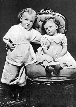 The couple, now nobility, had two children, Anna (born 1864) and Alexander (born 1866) before the birth of their third child, Vladimir "Volodya" Ilyich (Russian: Владимир Ильич Ульянов), on 22 April 1870, baptised in St. Nicholas Cathedral several days later. They would be followed by three more children, Olga (born 1871), Dmitry (born 1874) and Maria (born 1878). Another brother, Nikolai, had died several days after birth in 1873.[8] Ilya was a devout member of the Russian Orthodox Church and baptised his children into it, although Maria – a Lutheran – was largely indifferent to Christianity, a view that influenced her children.[9] Lenin's mother ran the household in a Protestant manner[10][11] Both parents were monarchists and liberal conservatives, being committed to the Emancipation reform of 1861 introduced by the reformist Tsar Alexander II; they avoided political radicals and there is no evidence that the police ever put them under surveillance for subversive thought.[12] The claim that Ilya exerted a revolutionary influence on his children is considered a myth. According to Lenin's sister Anna, he was a "religious man", a great admirer of the reforms of Tsar Alexander II of the 1860s, and "that he saw it as his job to protect the youth from radicalism."[3]