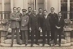 In 1919, the Chinese European delegation took a group photo in Paris (Jiang Baili on the second left, Liang Qichao on the third left, and Carsun Chang on the fourth left).